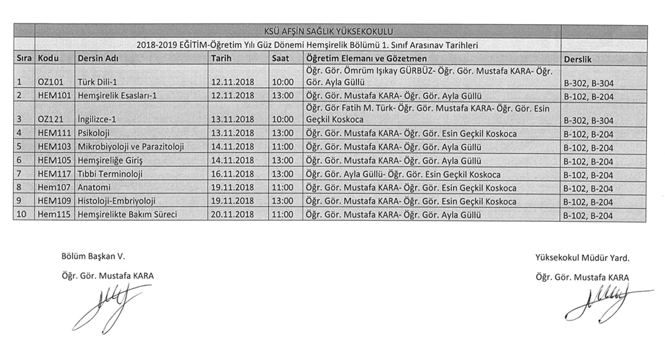 02.11.2018 - 1. Sınıf Arasınav Takvimi